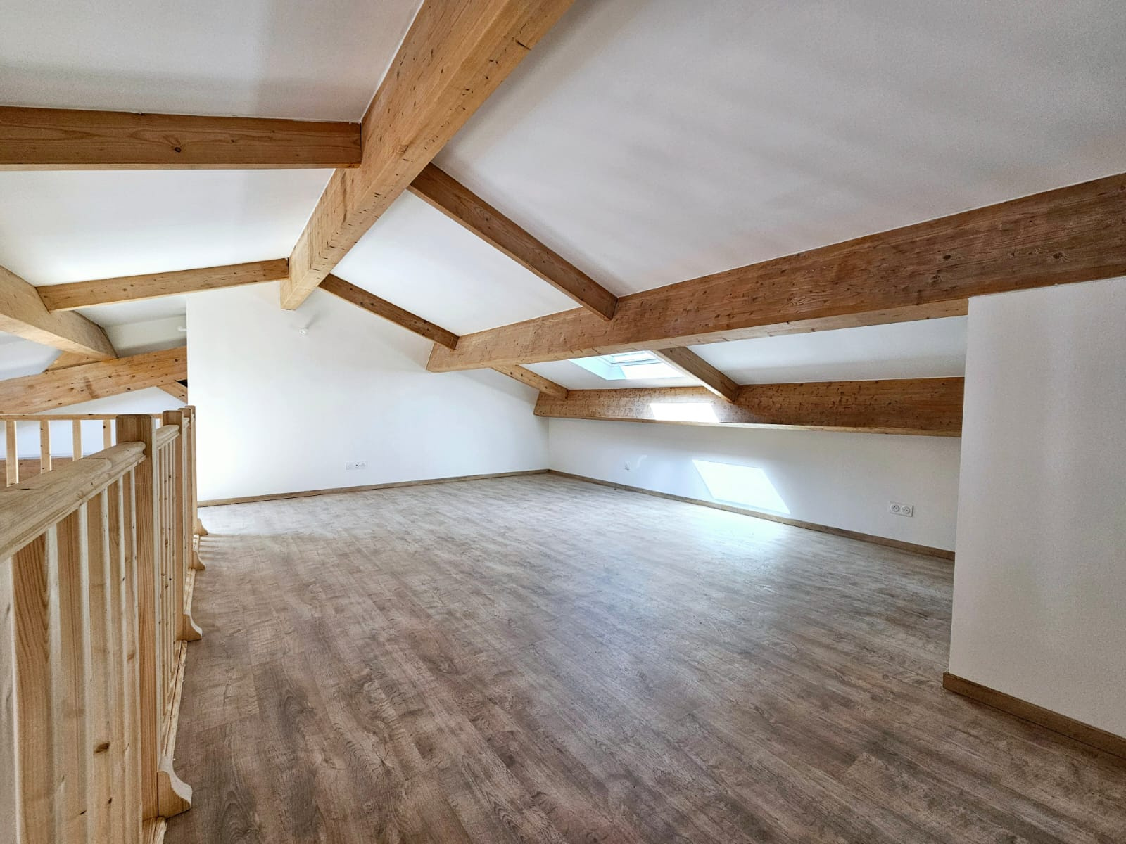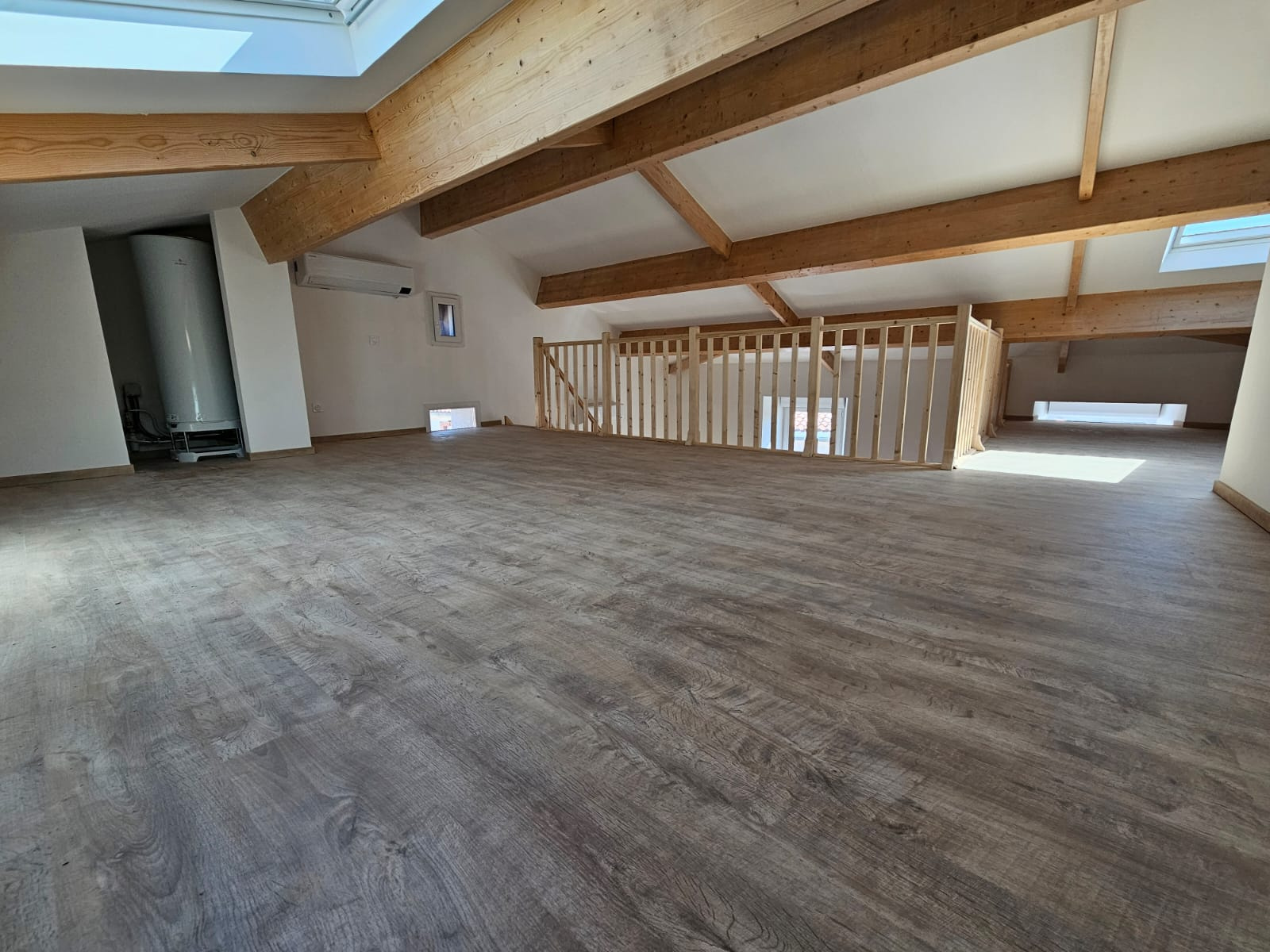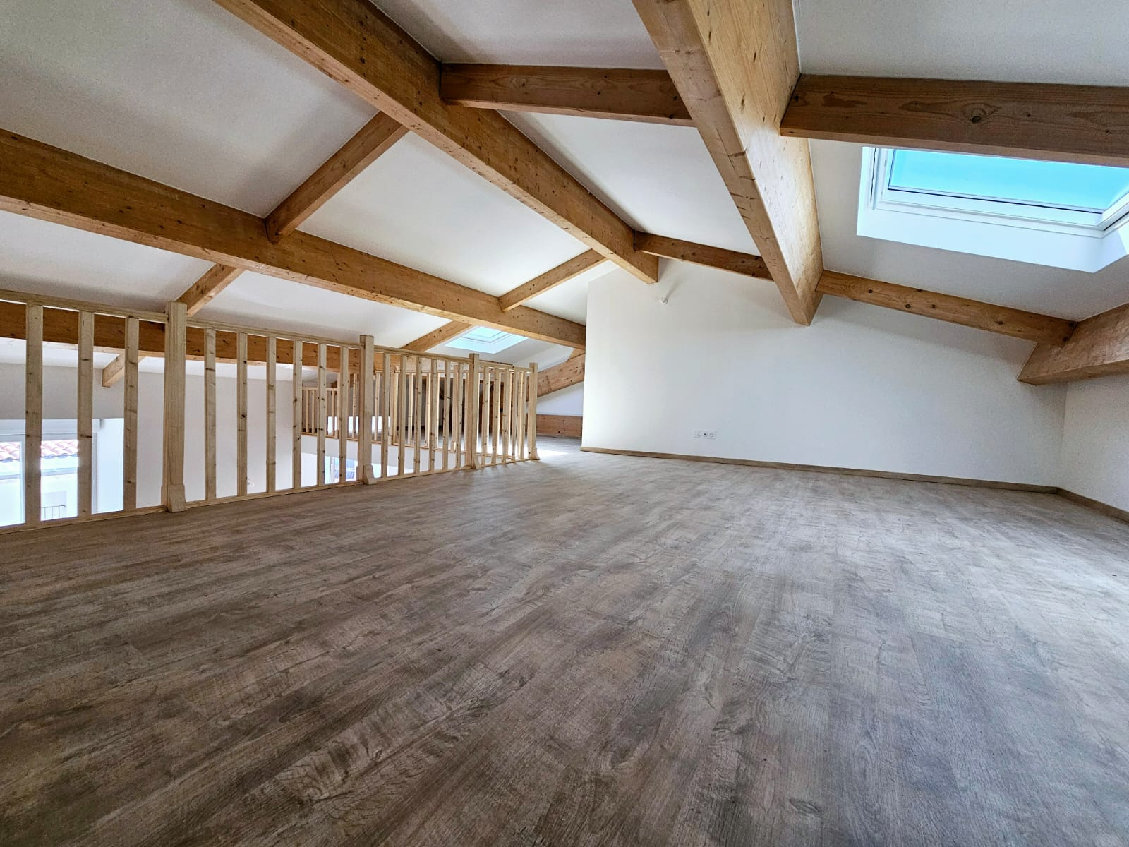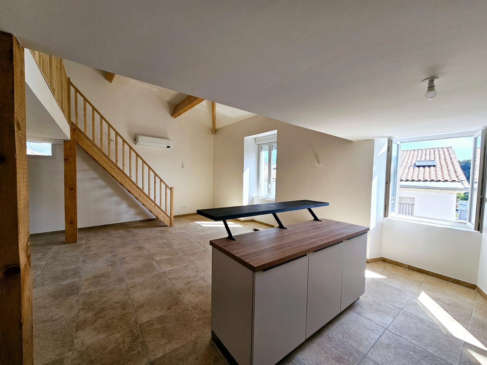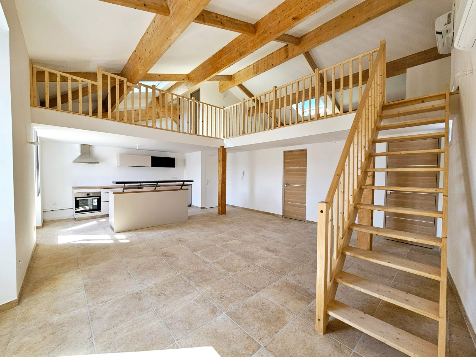 L’entrée ouvre sur une belle pièce de vie traversante, prolongée par une cuisine neuve, équipée et parfaitement intégrée. Une mezzanine spacieuse vient structurer les volumes et offre un espace supplémentaire, propice à un salon intimiste, un coin lecture ou un bureau.
